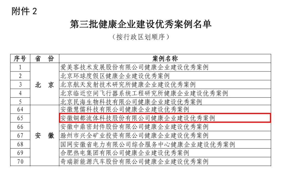2024年5月6日國家衛(wèi)生健康委辦公廳公布第三批健康企業(yè)建設(shè)優(yōu)秀案例名單,銅都流體成功入選國家衛(wèi)健委第三批健康企業(yè)建設(shè)優(yōu)秀案例名單,成為安徽省6家入選優(yōu)秀案例之一。