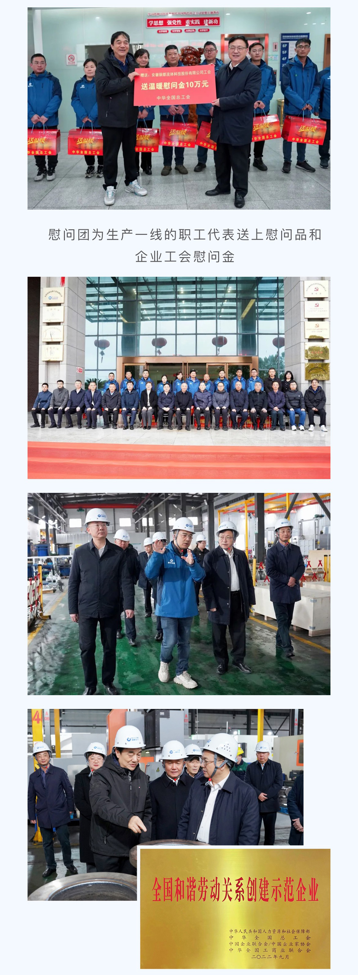慰問(wèn)團(tuán)一行對(duì)銅都流體獲得“全國(guó)和諧勞動(dòng)關(guān)系創(chuàng)建示范企業(yè)”榮譽(yù)作出充分肯定,并在董事長(zhǎng)楊成、總經(jīng)理?xiàng)盍杞芘阃拢巴a(chǎn)現(xiàn)場(chǎng),看望奮戰(zhàn)在生產(chǎn)一線的職工代表,為他們送上慰問(wèn)品和企業(yè)工會(huì)慰問(wèn)金,詳細(xì)了解企業(yè)生產(chǎn)經(jīng)營(yíng)和工會(huì)工作情況,指出企業(yè)工會(huì)組織要切實(shí)發(fā)揮作用,圍繞企業(yè)生產(chǎn),積極開(kāi)展各類勞動(dòng)競(jìng)賽和技能素質(zhì)提升活動(dòng),為職工的成長(zhǎng)成才搭建廣闊舞臺(tái),鼓勵(lì)廣大職工要充分發(fā)揮工人階級(jí)主力軍作用,用辛勤的勞動(dòng)創(chuàng)造美好的生活,為推進(jìn)中國(guó)式現(xiàn)代化貢獻(xiàn)自己的力量。