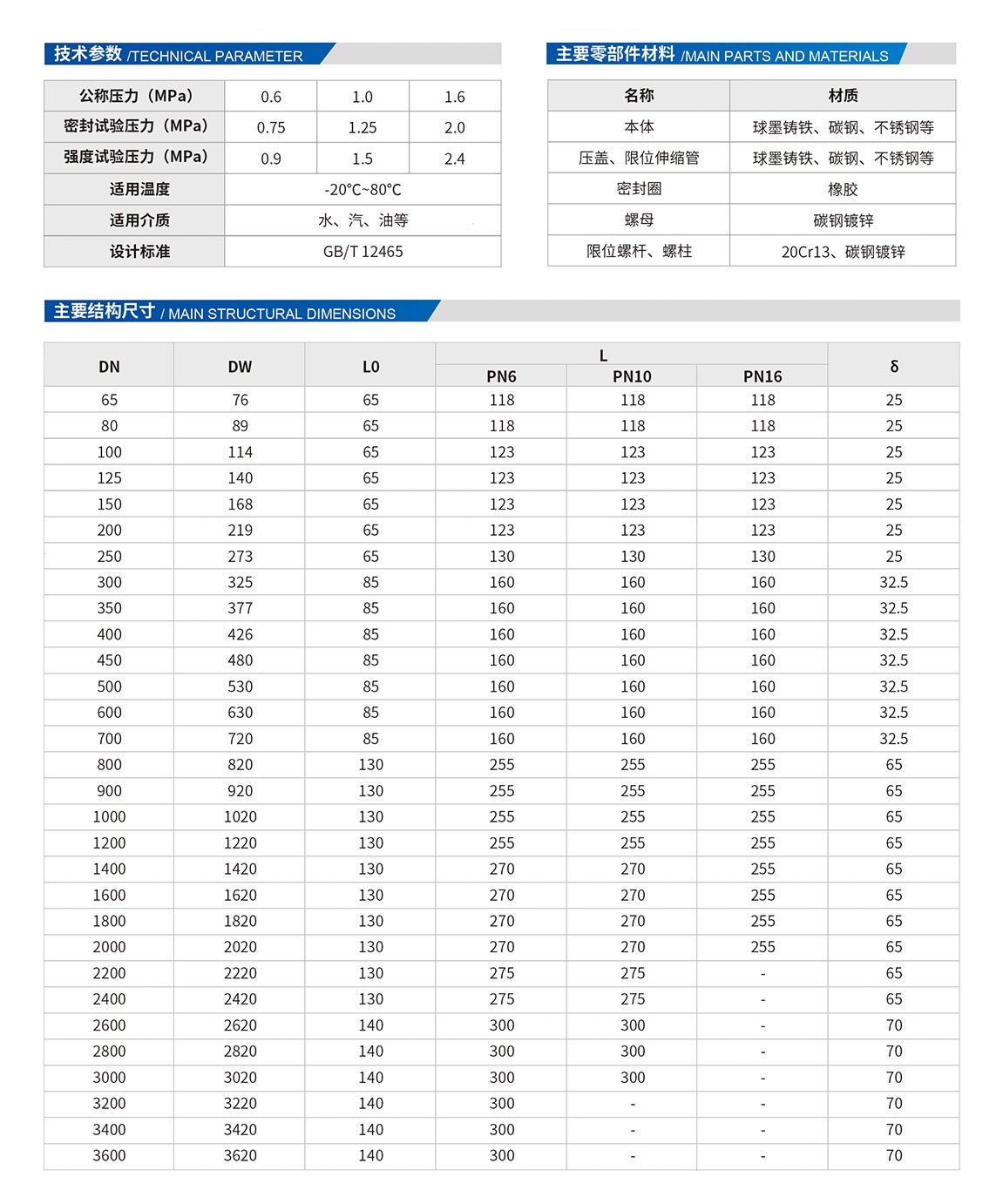 松套限位補(bǔ)償接頭安裝在管道上后,擰緊螺母,起到密封和連接作用。當(dāng)溫度變化時(shí),管子能在接頭中間自由地伸縮,當(dāng)?shù)鼗鲁痢⑵保艽_保密封無滲漏,從而達(dá)到自動(dòng)補(bǔ)償之目的。